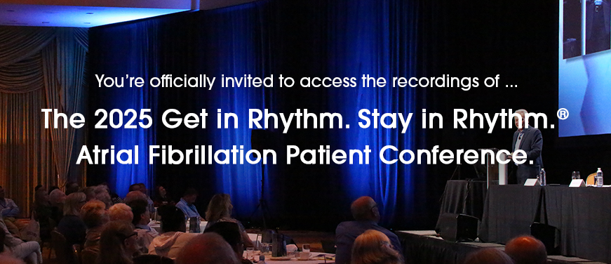 Purchase access to the recordings of the 2025 Get in Rhythm. Stay in Rhythm.® Atrial Fibrillation Patient Conference, and hear directly from the top researchers, cardiologists, electrophysiologists, surgeons, and other specialists at the leading edge of afib.